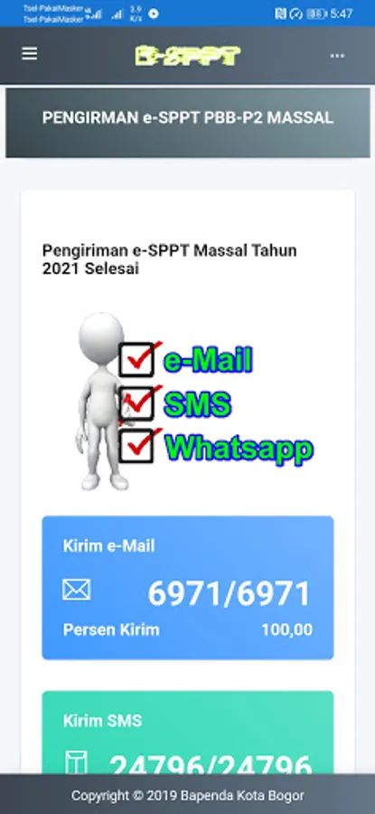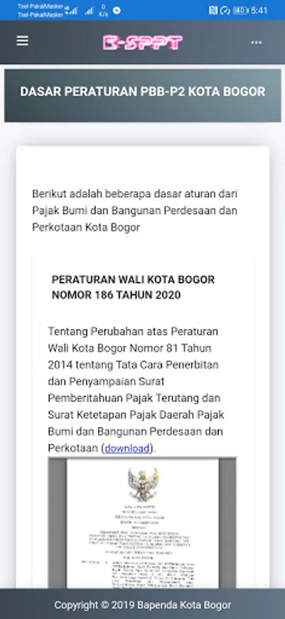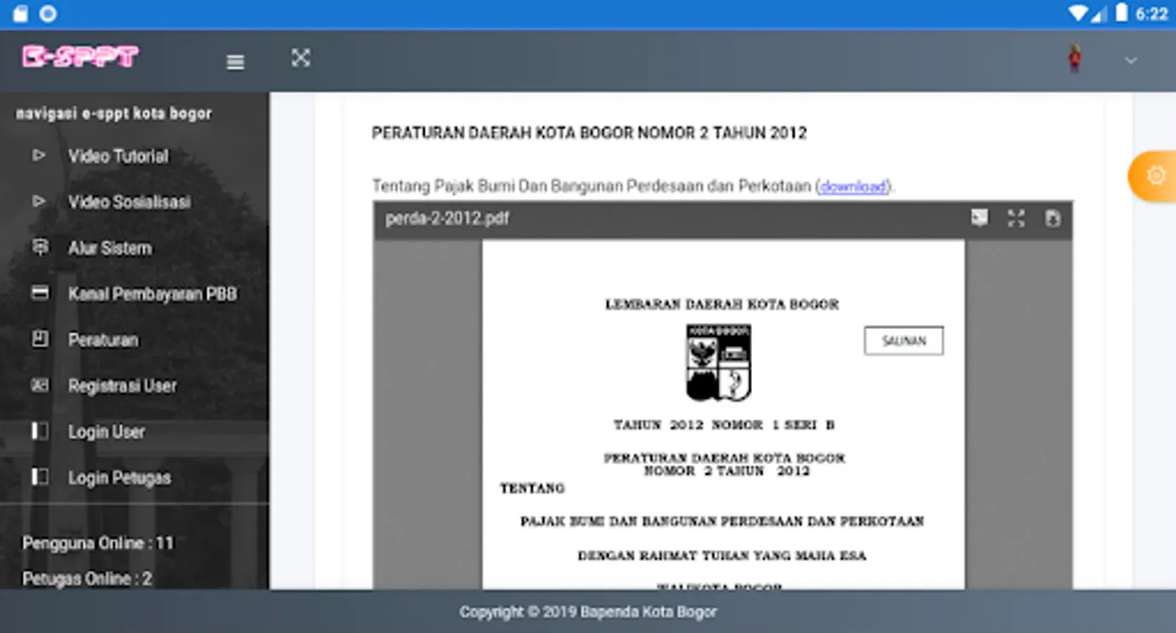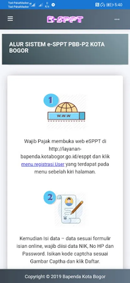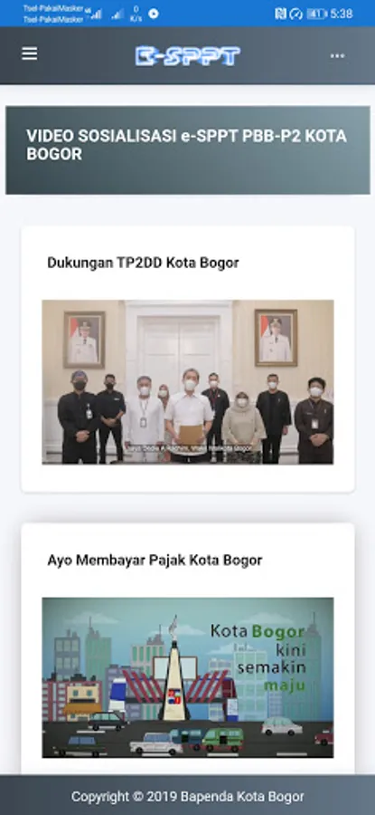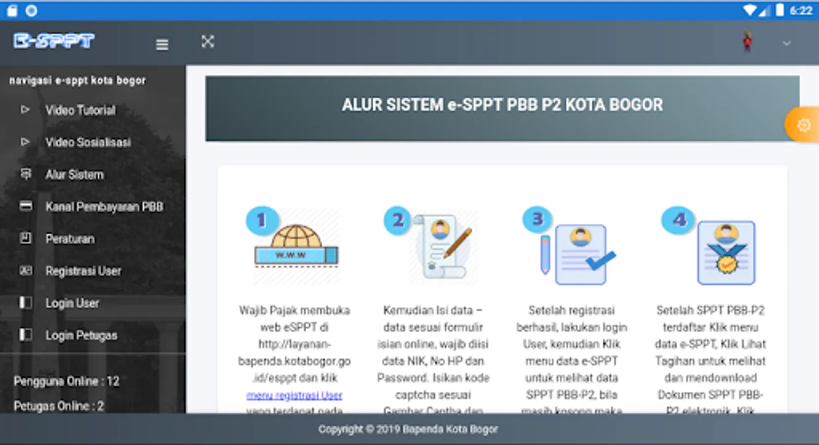 eSPPT PBB Mobile Kota Bogor adalah media online bagi Seluruh Warga Indonesia yang memiliki aset Tanah/Bangunan di Kota Bogor untuk mempermudah dalam memantau aset Tanah/Bangunan mulai dari tagihan dan riwayat pembayarannya dengan tampilan yang user friendly serta memudahkan dalam mendapatkan dokumen SPPT PBB-P2 digital.