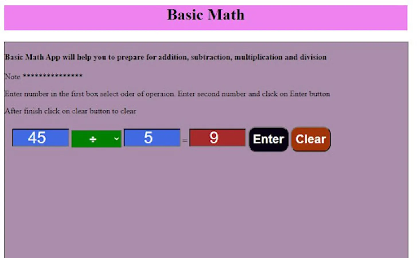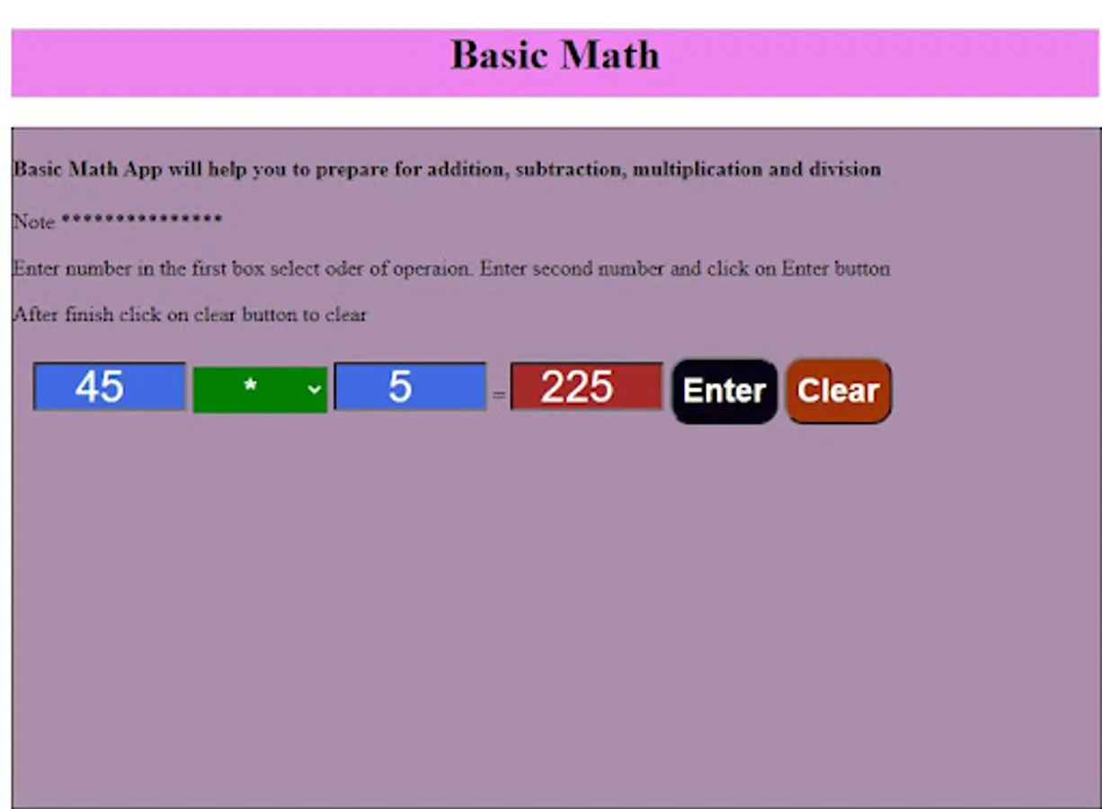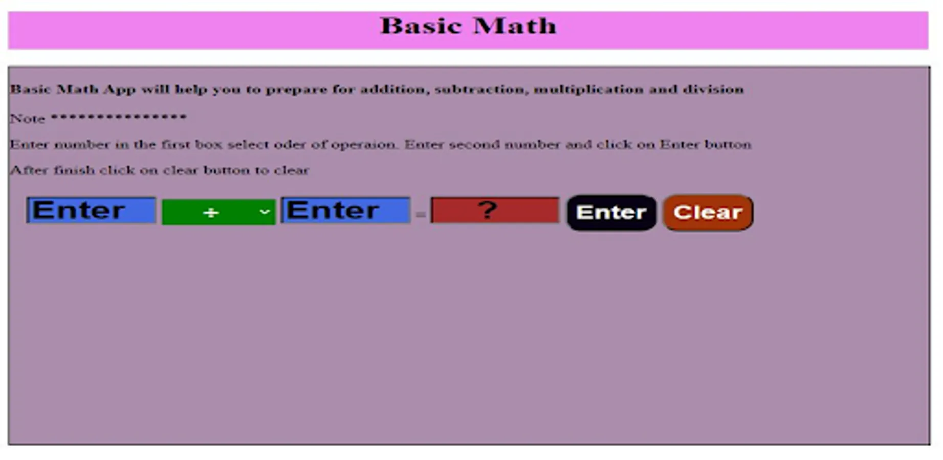 Free Basic Math app is design to practice Addition, Subtraction, Division and Multiplication.