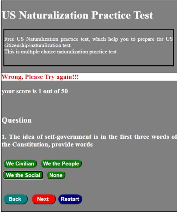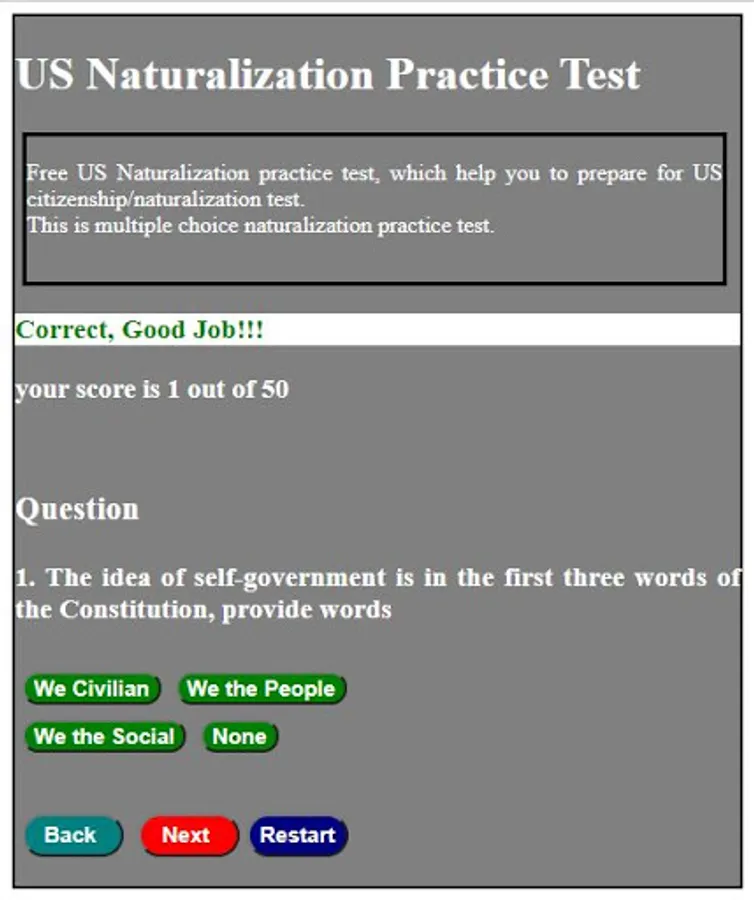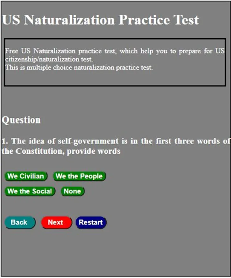 Free US Naturalization practice test, which help you to prepare for US citizenship/naturalization test. This is multiple choice naturalization practice test.