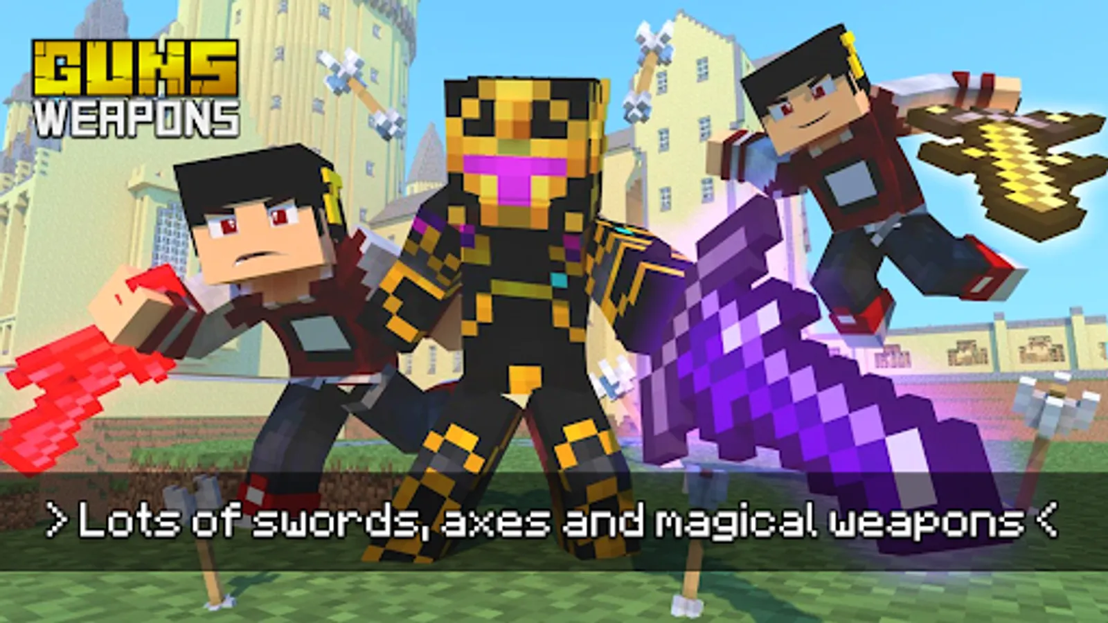 And here are some magical and edged weapons and other arms: Modern sword, Chainsaw, Excalibur sword, Thunder Bolt Hammers, Emerald sword, Double saber, Battle axe, Evocation Staff, Blazing sword, Scarlet Blade, Nether sword, Terraria weapons and a lot of others...