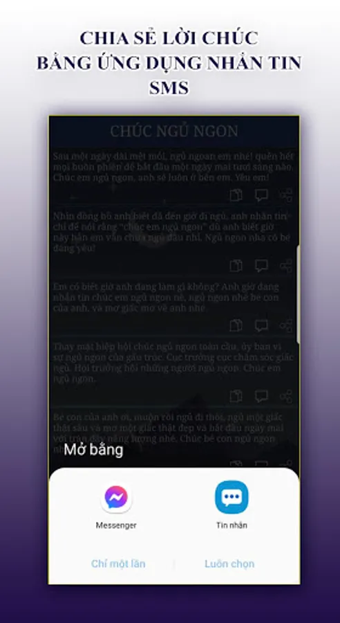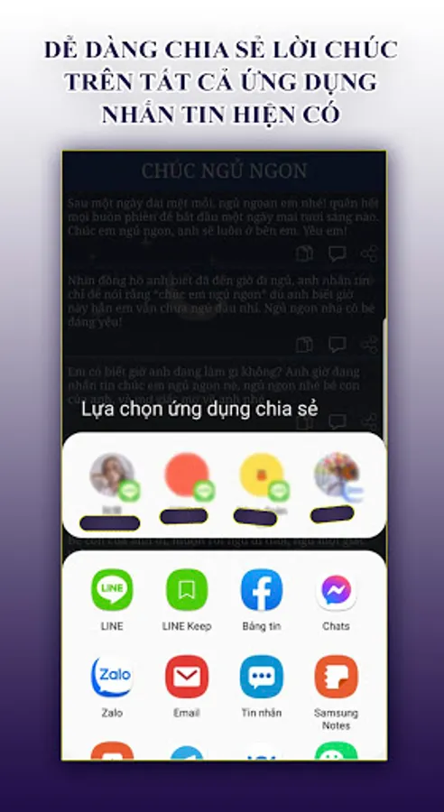 + Easily share greetings through messaging apps on the device; such as SMS, Facebook, Zalo, Line, Google+, Twitter, email ...