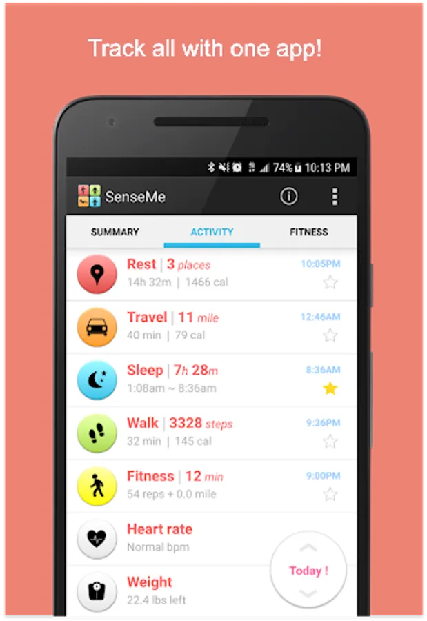 All-in-one fitness & activity tracker for your diet, weight loss and health! Track your walk steps, sleep, heart rate and more 24/7. It's 100% Free. No smart band or gadgets required. Work without internet connection and GPS.