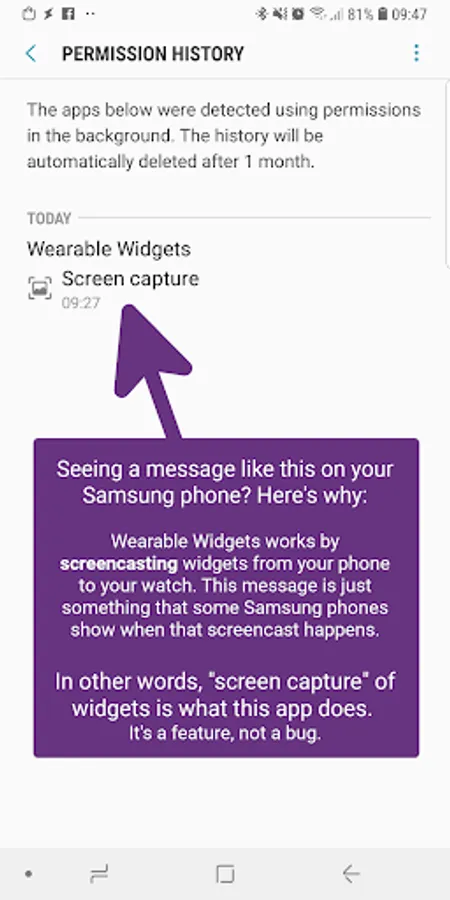 • Although you'll be viewing and interacting with widgets on your watch, this app is essentially just "screencasting" them: the widgets themselves are actually still running on your phone. This means that any actions that result from tapping on a widget will also occur on your phone. This is fundamental and isn't a "bug" that can be "fixed".