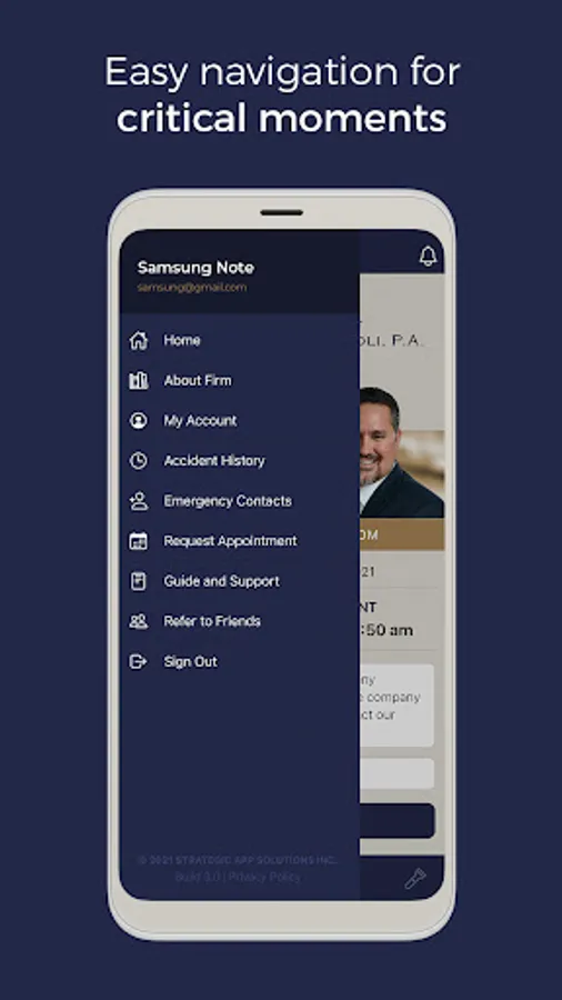 • Call 911 or our Law Office directly from the home screen of the application with a single tap.