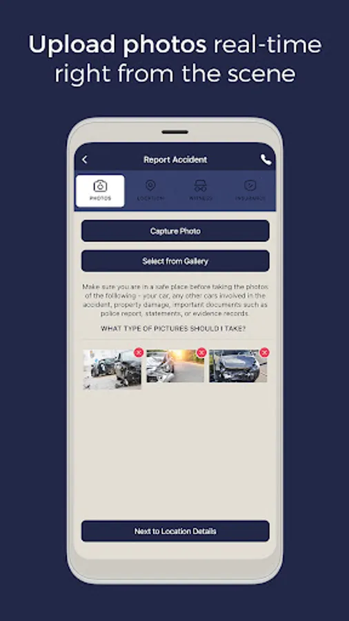 • An extensive, informative accident guide that helps understand the accident reporting process throughout the app.