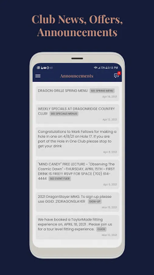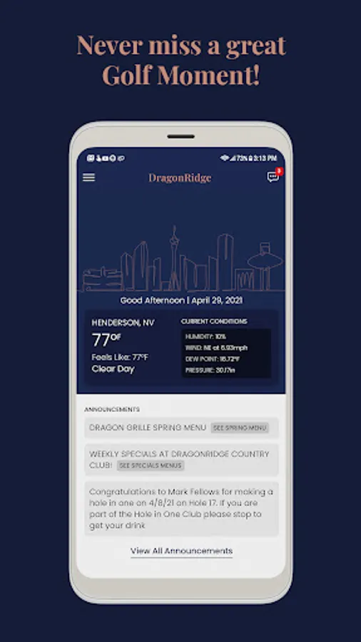 • Get the latest club news, event updates, exclusive offers, and course conditions right on your app home screen.