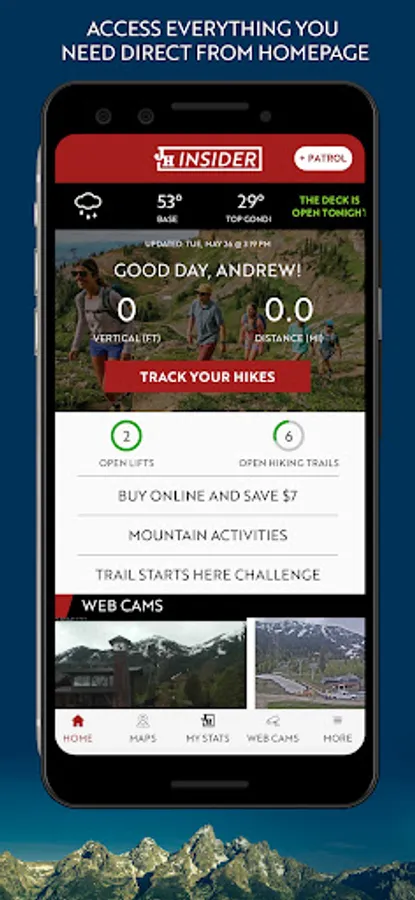 An essential tool for summer activities, information, and operations at Jackson Hole Mountain Resort. Designed with unique features that enhance the mountain experience, including hike tracking with GPS, up-to-the-minute lift and hiking trail status, top-to-bottom webcams, special promotions, and more. Be in the know, be a JH Insider!