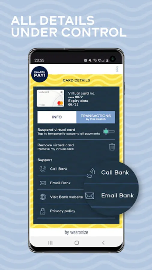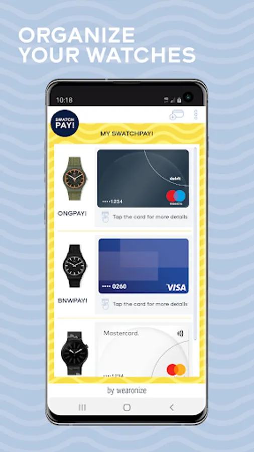 With the SwatchPAY! App by wearonize you can manage all your SwatchPAY! Watches and virtual cards.