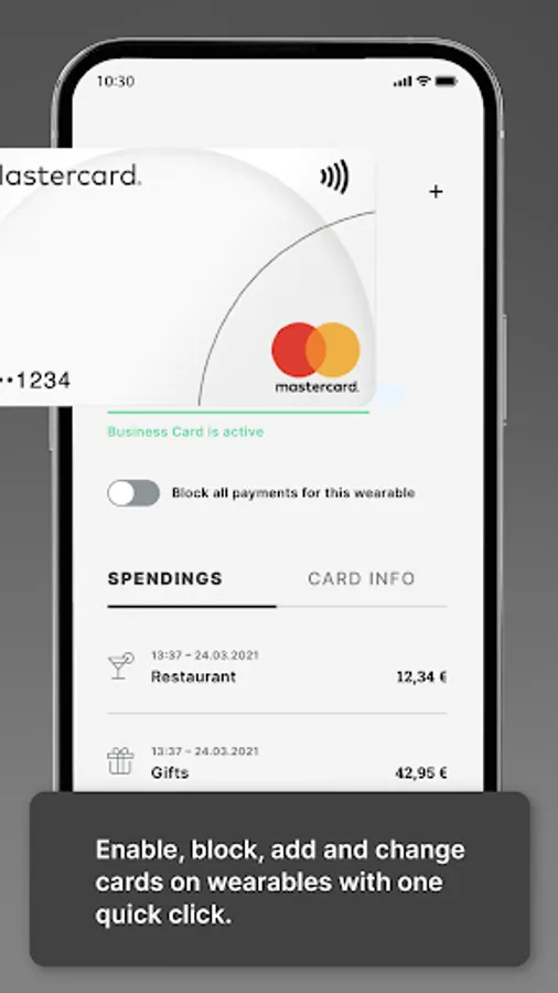 Enable, block, add, and change cards on wearables always accompanied by all the security requirements of Mastercard, VISA and Maestro.