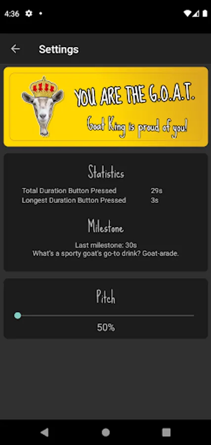 We've now added Statistics and Milestones features. Keep track of your hilarious antics, celebrate your achievements, and see how long you can press that button!