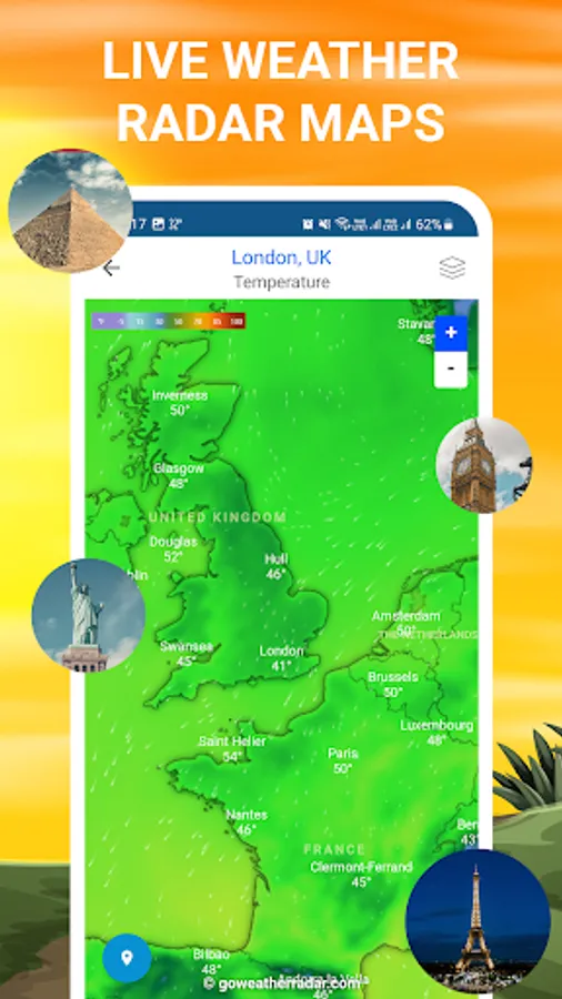 - beautiful and professional weather radar screens. Radar types: temperature, precipitation, clouds, wind, ...