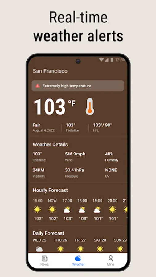 Hourly and daily weather forecast in detail provide important information on wind, pressure, ultraviolet index, and tips to stay safe.