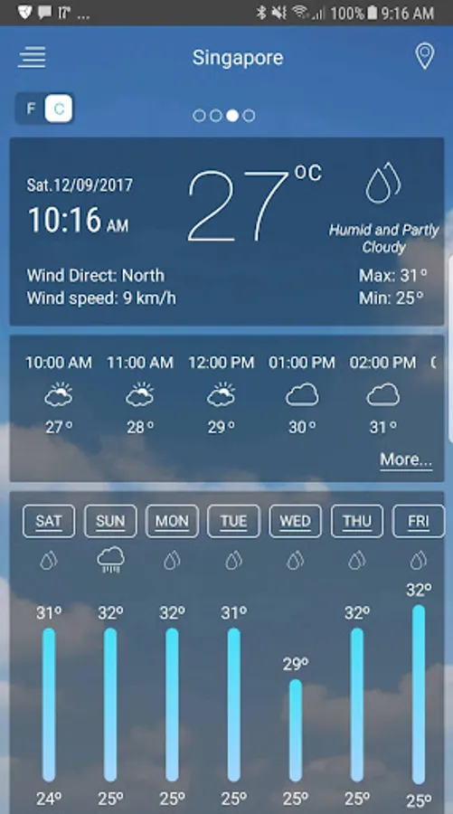 The weather app also provides atmospheric pressure, weather conditions, visibility distance, relative humidity, precipitation in different unites, dew point, wind speed and direction, in addition to ten days in future and hourly weather forecast.