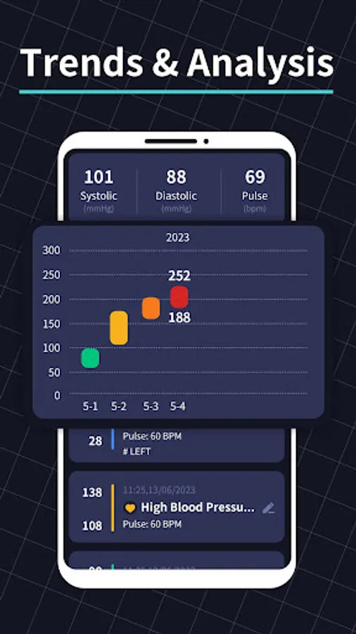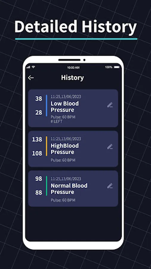 Blood pressure readings are saved and displayed in corresponding color columns for easy identification and monitoring. Easily and quickly view and edit your blood pressure and heart rate history. In our recorded charts, you can see comprehensive and clear records, track long-term health status, and compare values at different times.