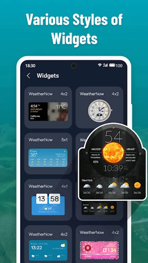 WeatherNow provides weather widgets that can display the current temperature in your location, and they can decorate your home screen with simple weather information, daily and hourly forecast.