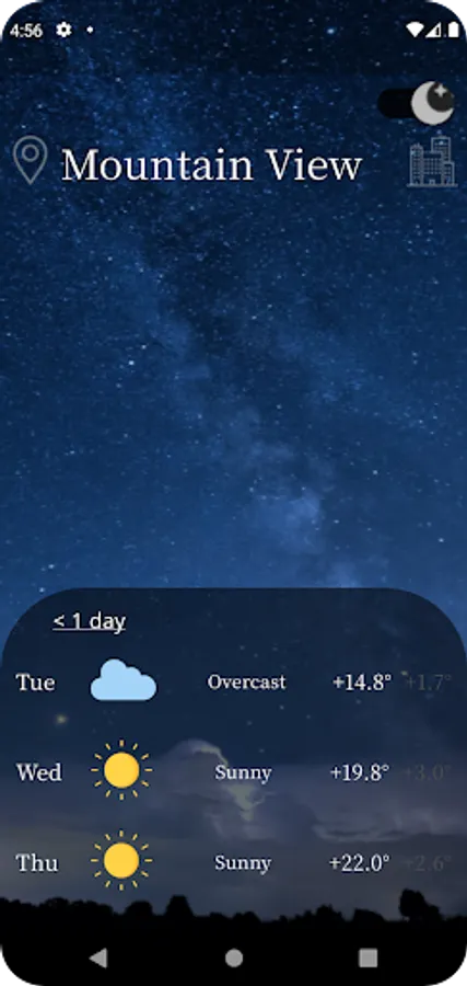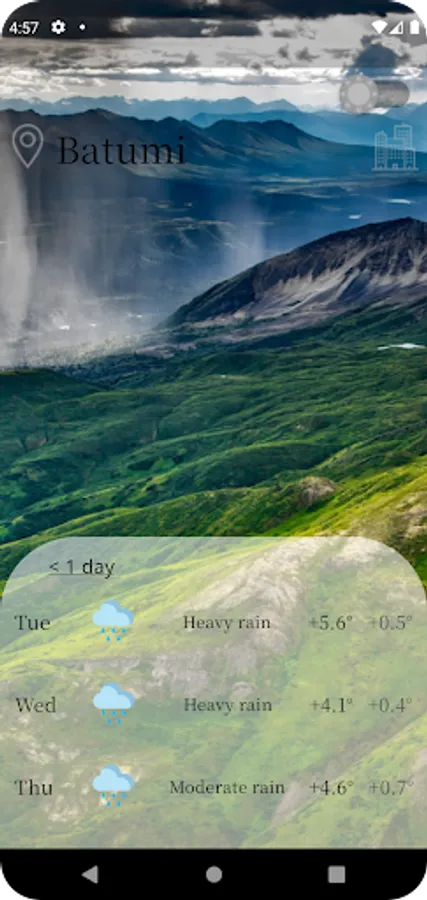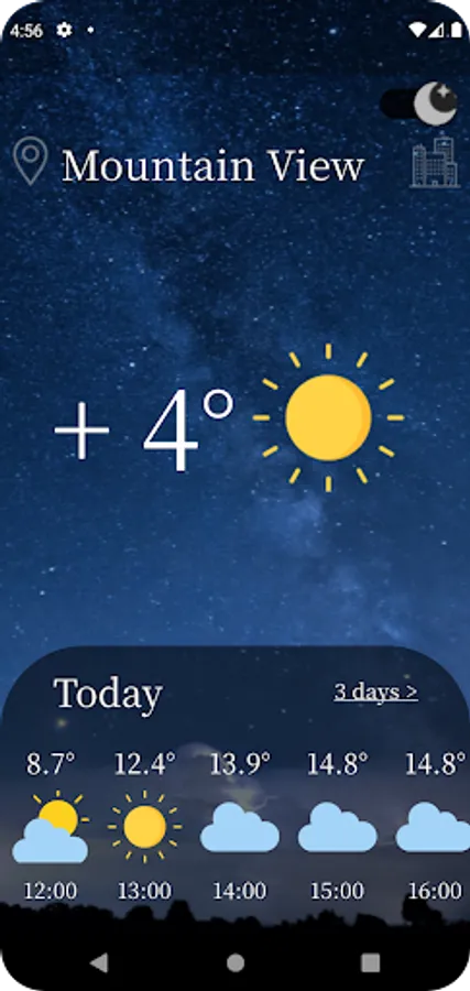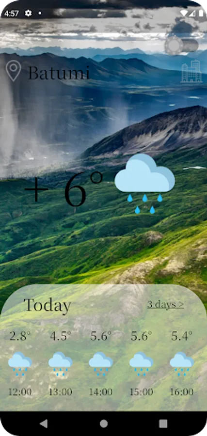 The app shows what the weather will be like in the 3 days, and gives hourly forecasts for your chosen location. The advantage of the application is that the user can get an accurate forecast with an accuracy of up to a tenth.