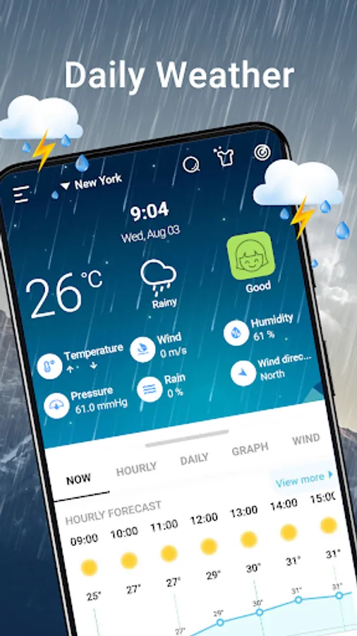 - Weather information like current temperature, precipitation, humidity, pressure, wind and more are displaying graphs.