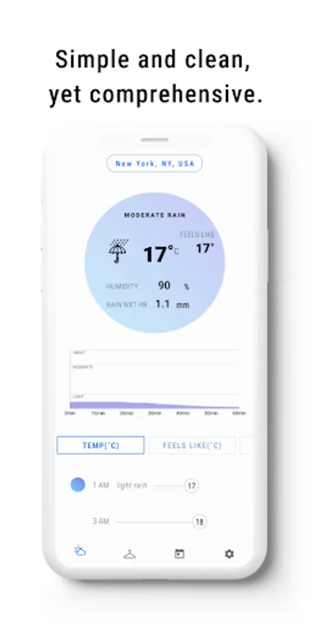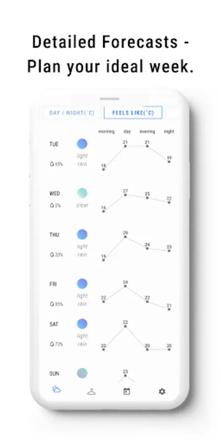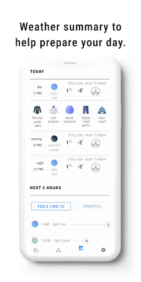 If you simply want to check the weather for a day for a specific location, go to Day Planner page. It has current weather info, forecasts and what to wear guide for morning, day, evening and night time and detailed forecasts for the next 5 hours. You can change the location in Settings page.