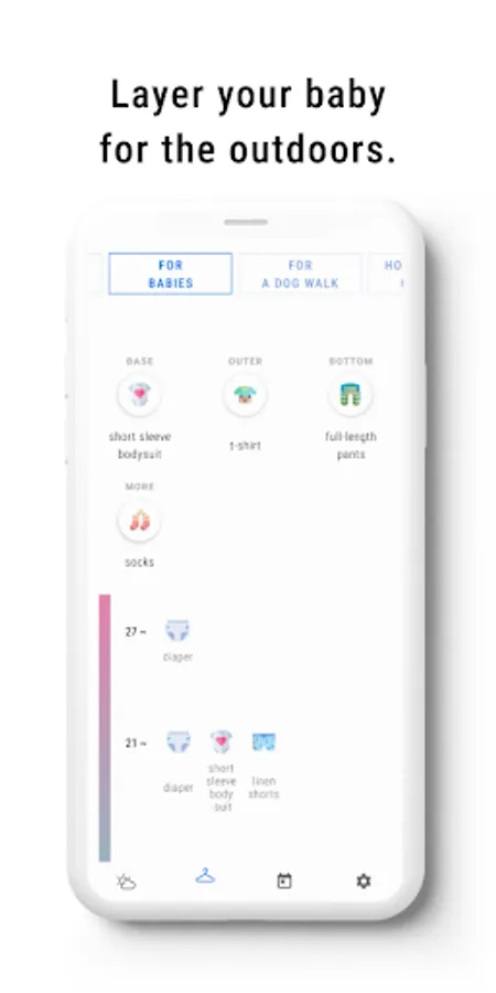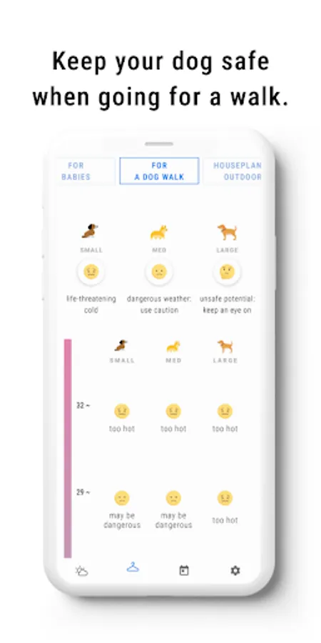 You can find clothing guide based on feel temperature for your location on the next page. Not only simple clothing guide, this page provides you what to wear for a run, dresses for babies, sun safety (UV), if it is right temperature for a dog walk or to keep houseplants outdoor and wind scale that shows wind condition, wave height, what size of umbrellas to use at different wind speed (m/s, km/h, mph, knots) and to decide if outdoor activities (camping, fishing, golf, wave height) are good to go in current wind condition.