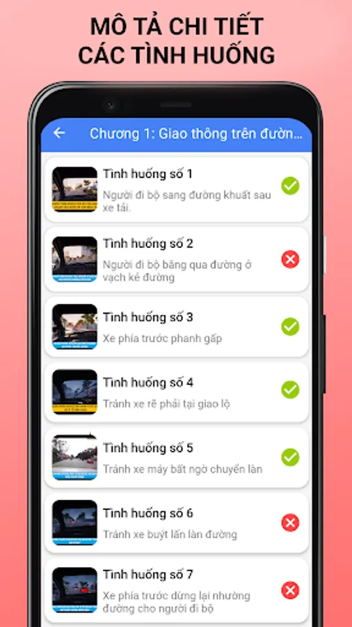 Chapter I: Includes 29 situations from 01 to 29 revolving around real-life situations frequently encountered when participating in traffic on the street in urban areas and densely populated areas.
