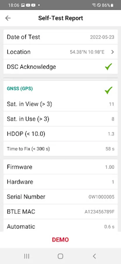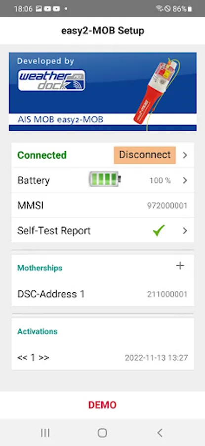 With this app you can setup your man-over-board device easy2-MOB. The app connects via Bluetooth to the device. Then you can enter mothership MMSI, which will be alerted in case of emergency activation. Additionally you can check the self-test of the easy2-MOB and the status of the battery.