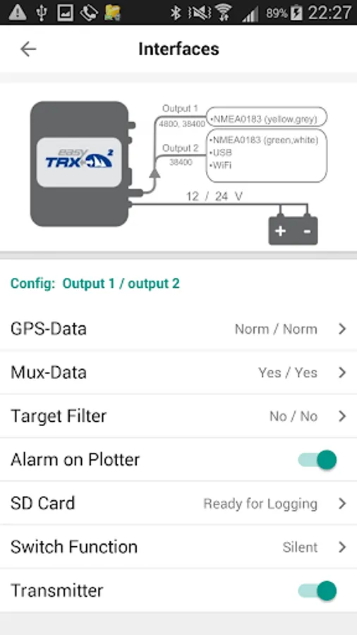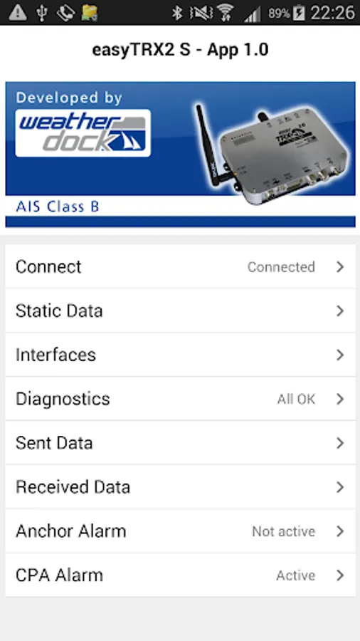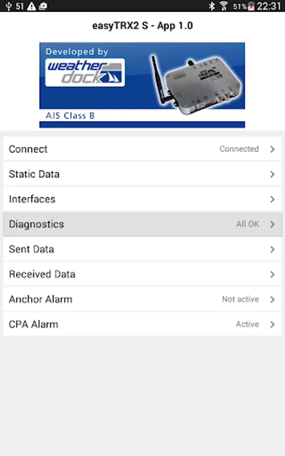 If your easyTRX2(S) [AIS Class B - Transponder] has got the WiFi-Option, you can use this App as an alternative to the USB-ProgrammingTool. You just connect via WiFi with the easyTRX2[S]. Then you have the ability to program (e.g. static data, Interface Settings, anchor alarm, CPA-Alarm and Silent-Mode] or you can get Information from the device [e.g. Diagnostics, Shiplist].