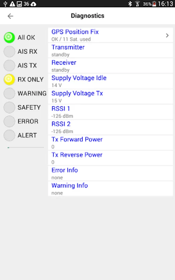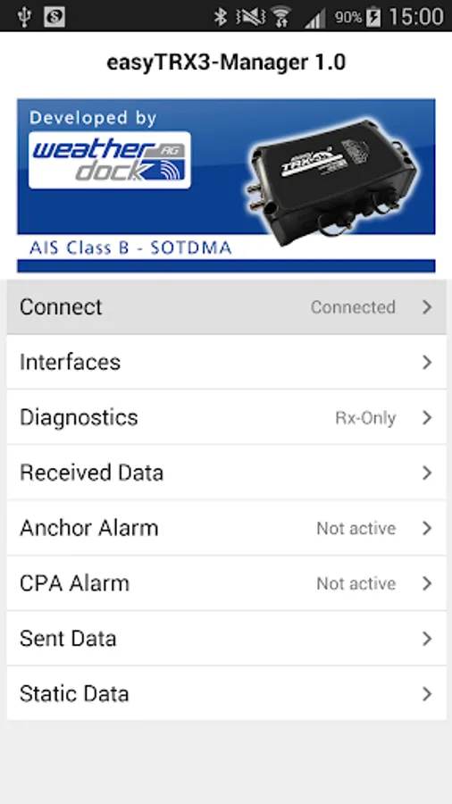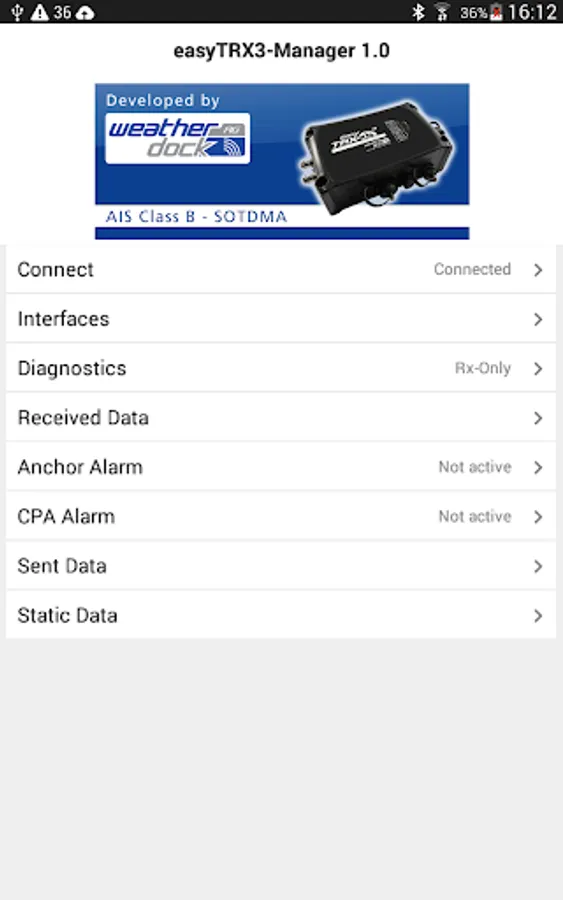 With this app you can setup the settings of Weatherdock easyTRX3. You are able to enter your ship's MMSI and the static data of your vessel, like ship's name call sign and type of vessel. You are also able to configure the Interfaces (USB, NMEA0183, N2K, WiFi, GPS). A diagnostic view shows the health of the easyTRX3. Additional features like anchor alarm or CPA alarm can be configured and turned on and off. Received AIS data from other ships are displayed in a ship list or on GoogleMaps.