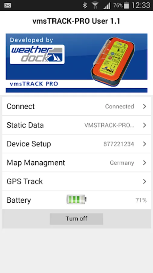 This app allows you to read-out the vmsTRACK-PRO via Bluetooth. You can show the static data and the battery status. The vmsTRACK is a transmitter which is used for vessel management service or tracking of small vessels like fishing boats. The vmsTRACK is transmitting its GPS track regularly via VHF. Additionally the track is also stored in internal flash memory. With this app you also can read-out this track and show it on GoogleMaps(TM).