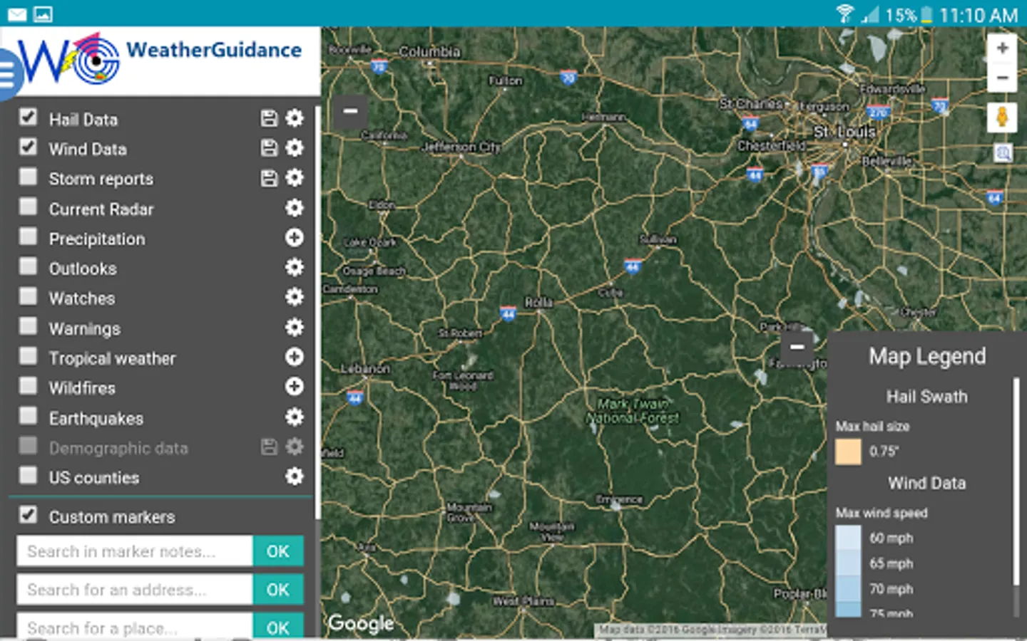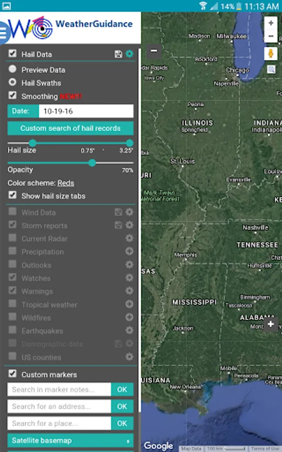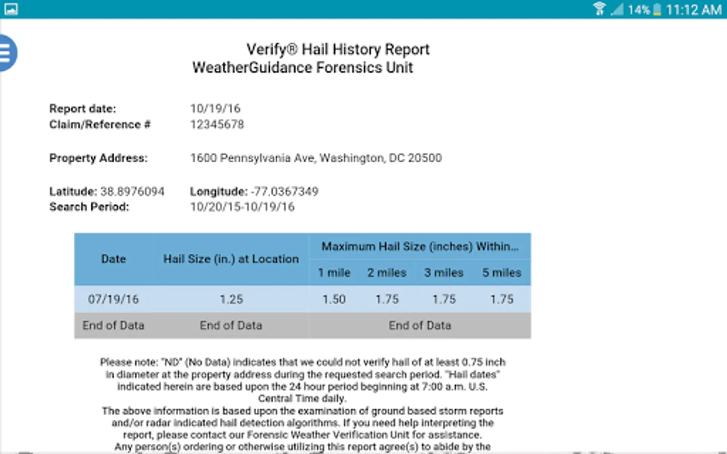 High resolution mapping of hail, high wind and tornado events. Ability to generate address specific hail and wind history reports. Ideal for the roofing, paintless dent repair, and glass replacement industries as well as insurance adjusters and storm damage inspection teams. You must be an active StormIntelligence member to be able to login and use the app. Please visit www.weatherguidance.com to sign up.