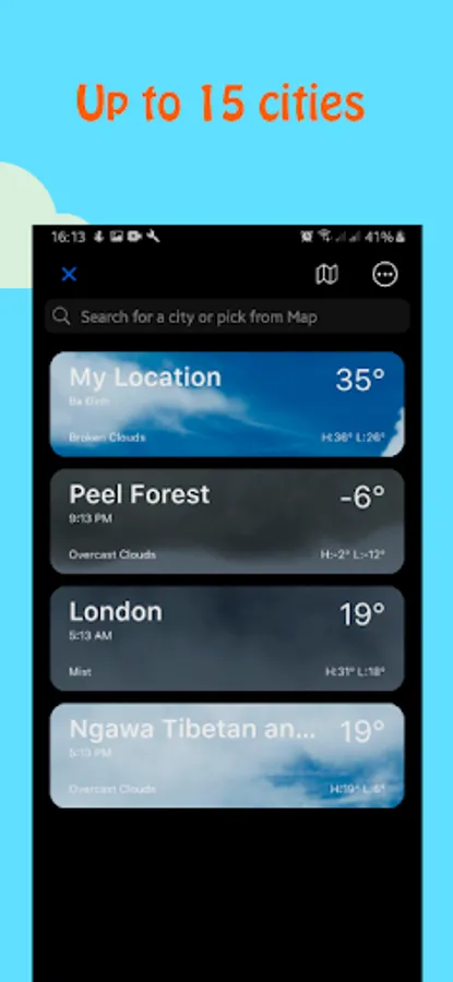- Planning a trip, want to see the weather in your hometown, want to check weather conditions in cities where your family members live ? Just add any city in the world and see the live weather for that city.