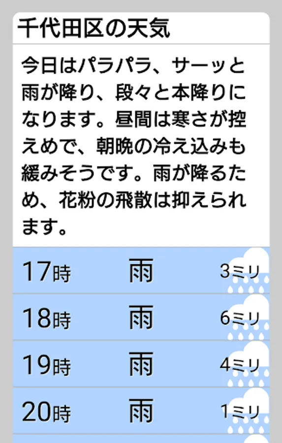- 今日の天気、明日の天気(1時間ごとの天気、気温、風向、風速)
