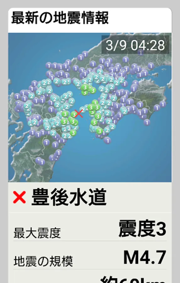 - 地震情報(地点ごとの震度、最大震度、地震の規模、震源の深さ、過去の地震リスト)