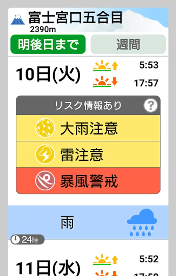 - 山の天気(6時間ごとの天気、気温、風速、荒天リスク情報、火山情報)