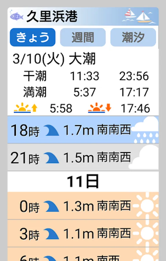 - マリン天気(3時間ごとの天気、気温、風向、風速、波高、満潮時間、館長時間、日の出日の入り時間)