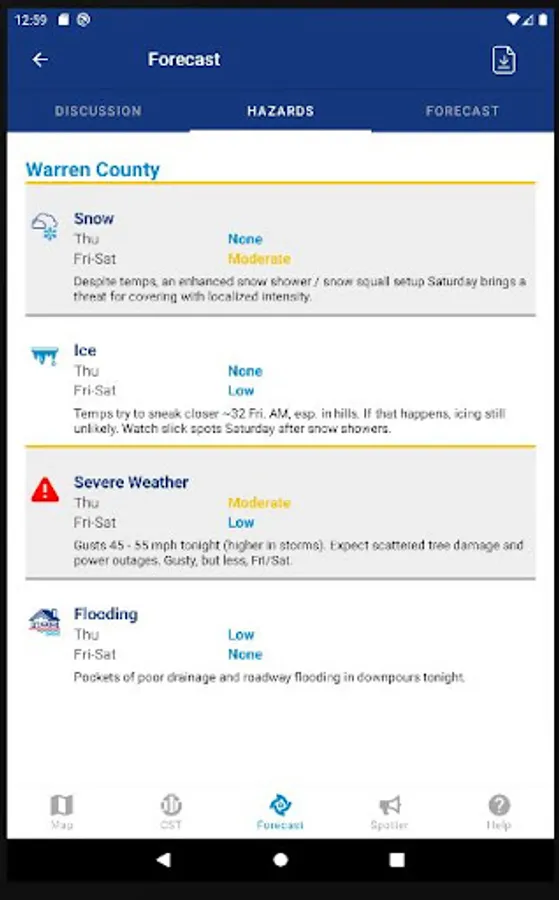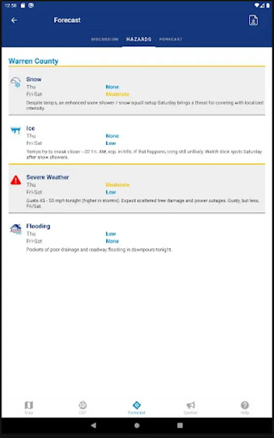 - Receive a push notification when a Heads-Up is issued for your area (optionally have your phone play the WeatherWorks “weather notification” tone)