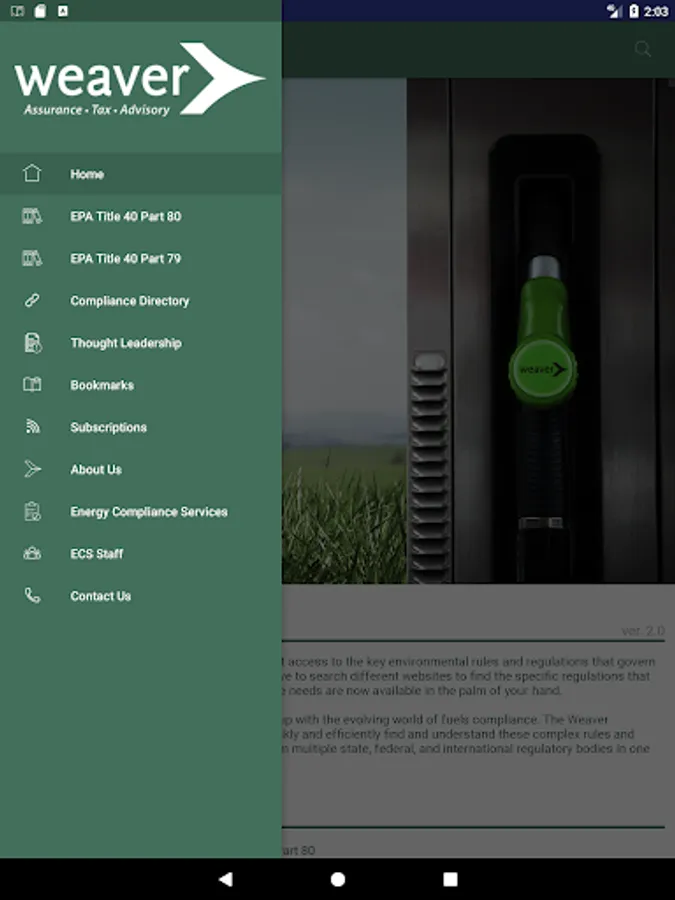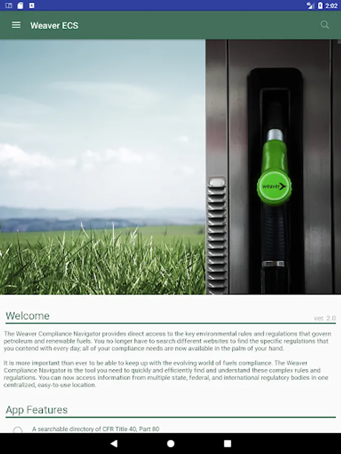 The Weaver Compliance Navigator provides direct access to the key environmental rules and regulations that govern petroleum and renewable fuels. You no longer have to search different websites to find the specific regulations that you contend with every day; all of your compliance needs are now available in the palm of your hand.