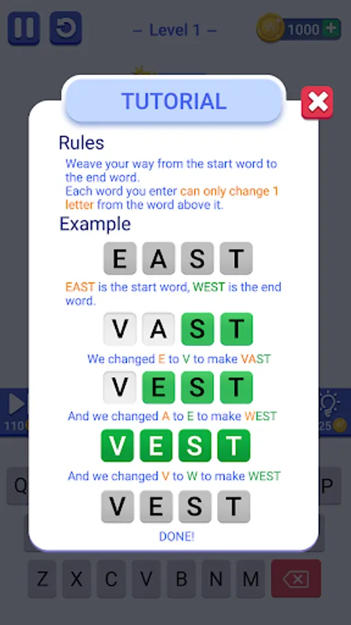 - If you don't know which word to continue, you can use hints to help you find the answer.