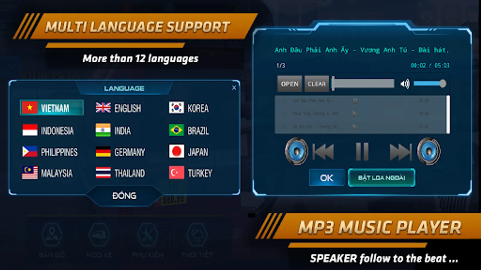 - There is a GARAGE system to upgrade the vehicle, with more than 40 types of paint colors, nearly 20 types of wheel lazang wheels and dozens of additional accessories for each type of vehicle such as helmets, flags, car assistants, ...