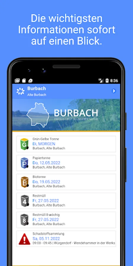 The waste app of the municipality of Burbach. Always stay informed - about collection dates, collection points, problem waste and much more.