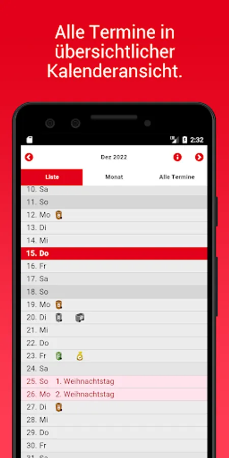 The app makes it possible to save collection appointment reminders directly in your device calendar. This requires the "Calendar" permission.