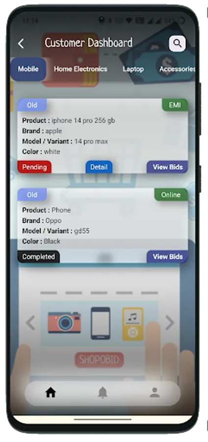 The user sees all bids by various shopkeepers and finalizes one of them by paying a small commission to Shopobid to confirm the deal and to know shop details . The user gets his product at his best price and without roaming here and there for the same.
