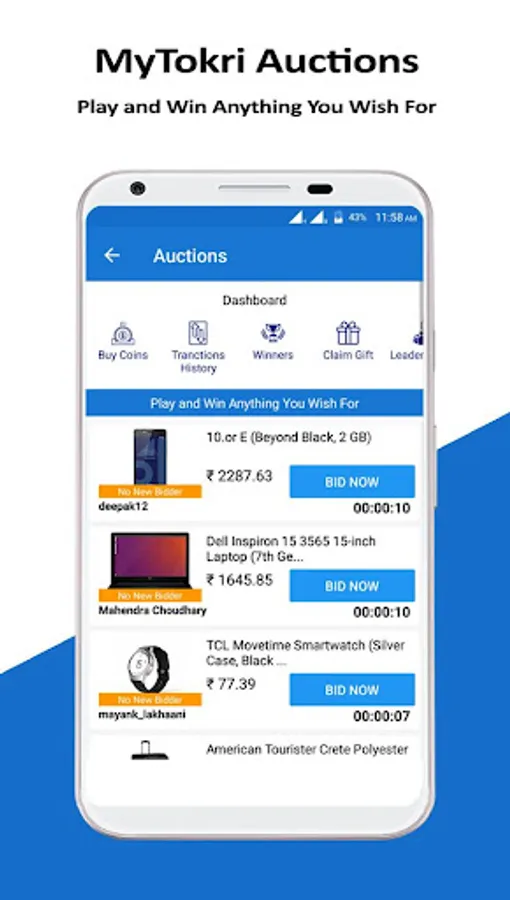 Online Auction: Mytokri offers you online bidding auction. From now onwards cease to think of the products price. Provided that you need to sign in Mytokri app, explore all available products for bid, start bidding and win products at the smallest bid you placed.