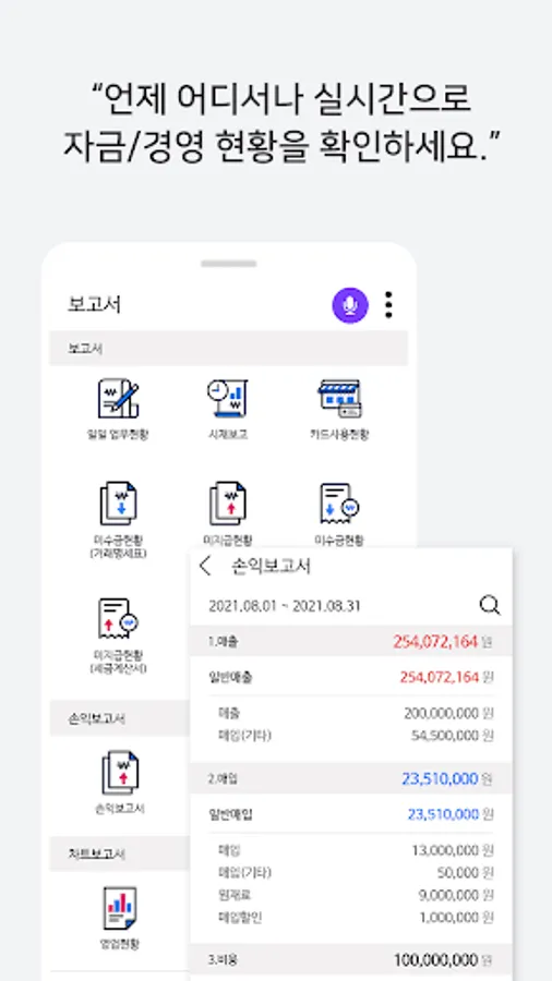 You can inquire various reports such as customer information, account entry and exit history, daily business status, trial report, and profit and loss report.