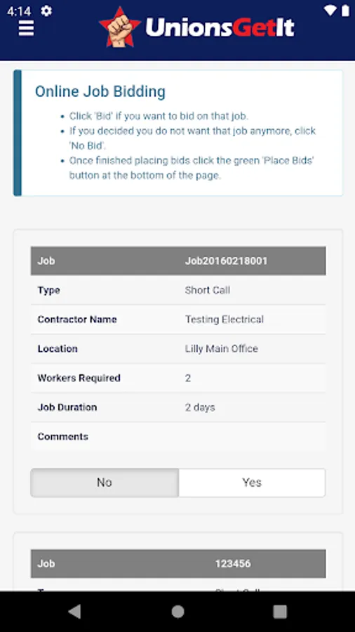 Bid on jobs. No more calling the job line. If there are jobs available, you can bid on them directly from the app.