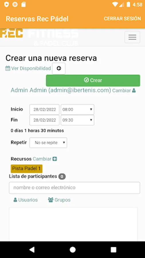 Facility reservation system for Rec Fitness & Pádel Club. From this application you can make the reservation, management and consultation of the Rec Fitness & Pádel Club facilities.