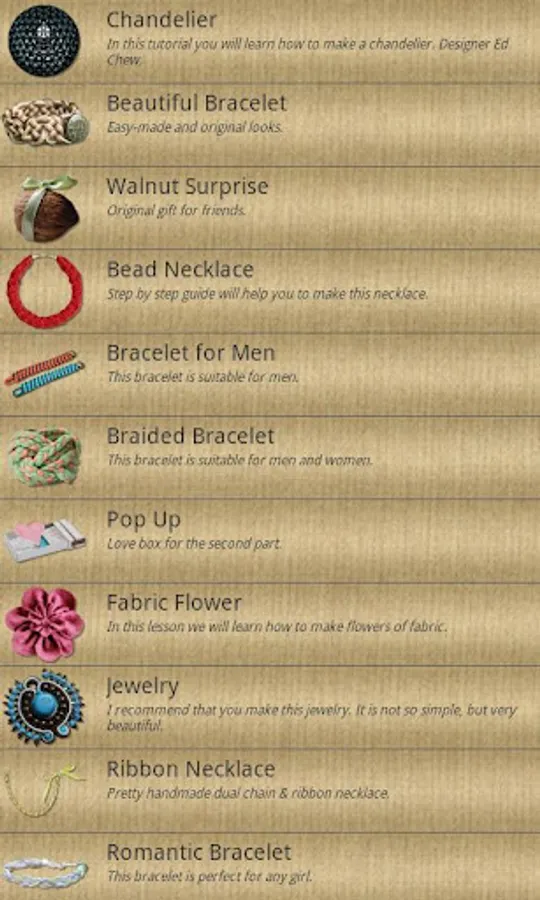 Handmade stuff - it is the best gift that you can get or give. This app helps you to learn how to make christmas, greeting and birthday cards or love cards. You will know how easy you can make toys and Christmas snowmans. If you are looking for a gift for your boyfriend you can make beautiful bracelet for him. If you're a guy and looking for a gift for your girl I recommend to watch "Walnut Surprise", "Bead Necklace" and "Love Pop-Up" in this app. We tried to find the most interesting lessons, but we will add more and more interesting stuff. In future versions we plan to add handmade lessons in sewing and knitting to help you give happiness and smiles of your family and friends. At this time app include tutorials how to make flowers of paper, rings, decorative pillows and etc. Be happy!