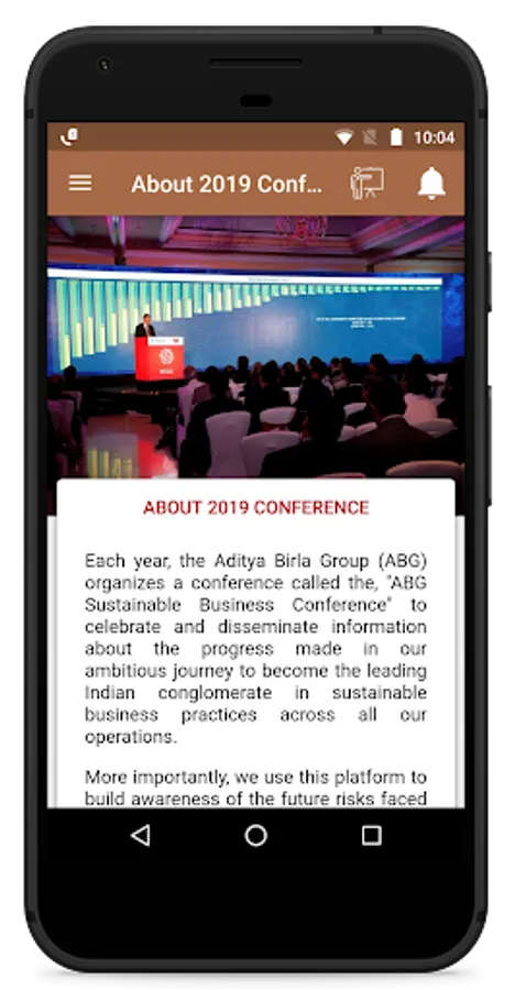 This application provides ABG employees with relevant information regarding the Sustainable Business Conference 2018 being held at Mumbai. The application provides updates through push notifications to the users regarding the schedule of the event, speaker profile and other announcements. ABG employees will also be able to register themselves for the conference. During conference this app will provide opportunity to rate the session, to ask the questions or to send comments by attendees.