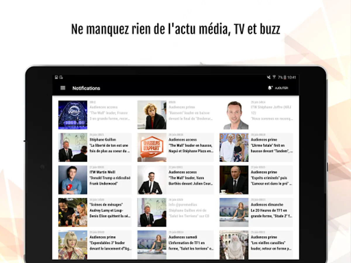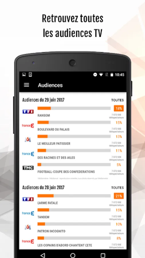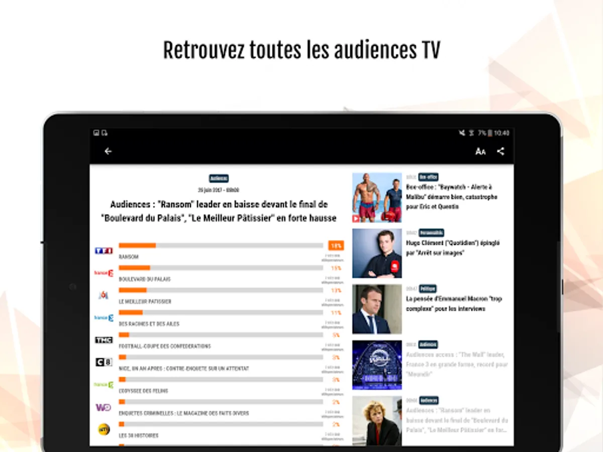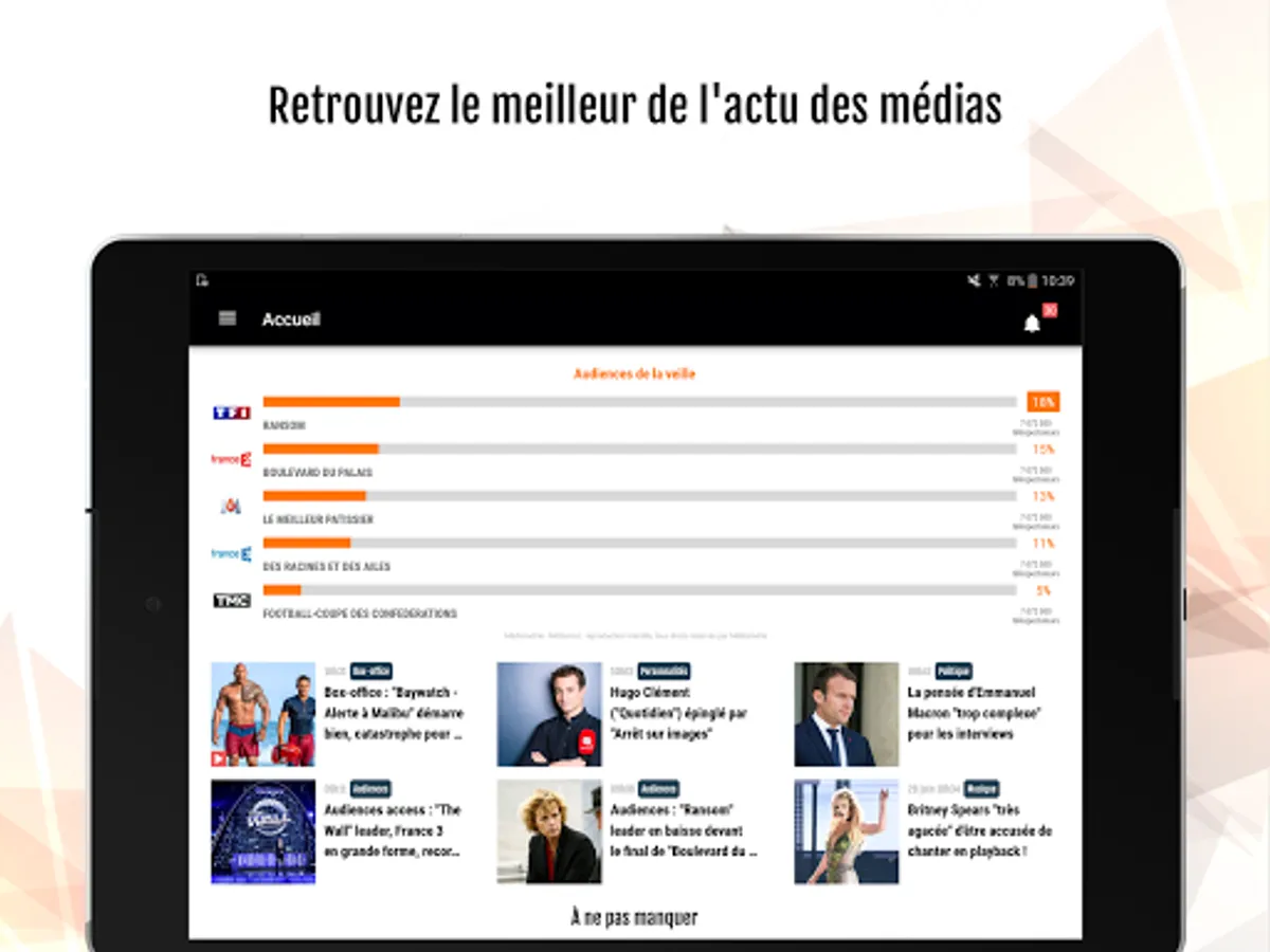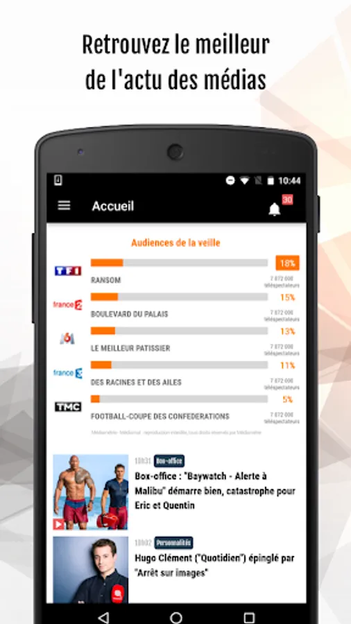 - les audiences TV de la veille (chaînes linéaires hertziennes et TNT), avec des analyses et bilans d'audiences sur les grands rendez-vous