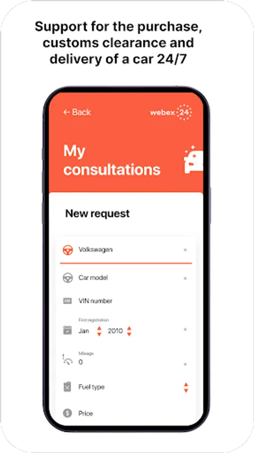 Buying and paperwork for transport anywhere in the world will be easy with webex24. Complete information about your deals literally "in your pocket". Suitable for brokers, car traders and car dealerships, car houses and drivers who deliver vehicles from anywhere in the world and by any transport. Request vehicle purchase deal, clarify any details during the process using chat with your manager and get notified about the process in real time. Send and receive needed documents using the app, obtain preliminary evaluation on the go and review accumulated cost breakdown directly in your request.