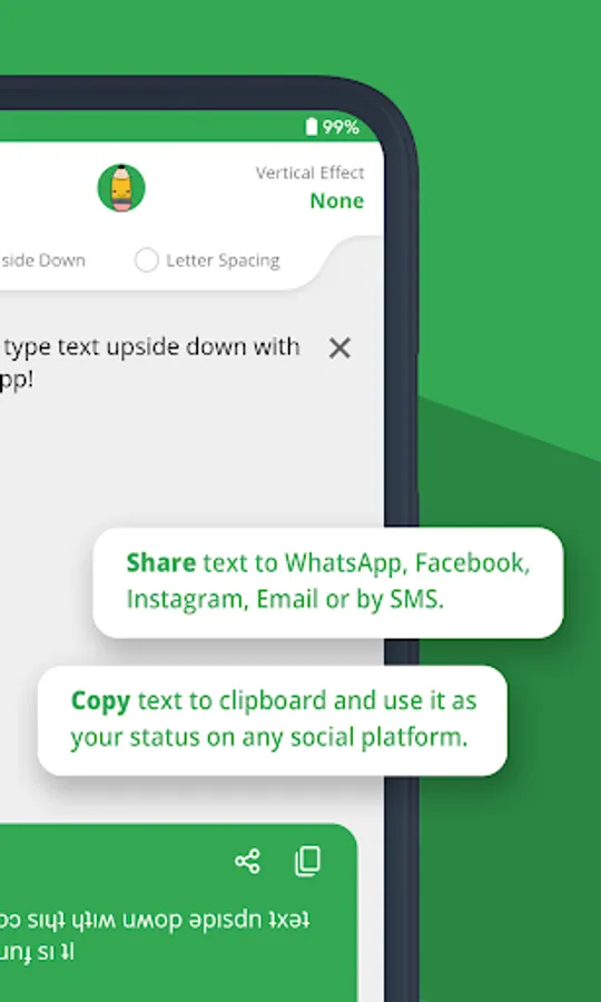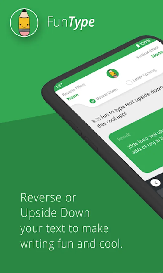 With FunType, you can spice up your text by adding effects like reverse (backwards) or flip (upside down). You can also type vertically by letters or words.